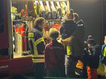 Nach dem Umzug hatten die Kinder die Möglichkeit, das Feuerwehrfahrzeug aus nächster Nähe zu betrachten. Mit eingeschaltetem Lichtmast sorgte das Fahrzeug nicht nur für eine zusätzliche Sicherheitsbeleuchtung, sondern auch für eine tolle Atmosphäre beim anschließenden Beisammensein. Natürlich weckte das die Neugier vieler Kinder! Sie nutzten die Gelegenheit, um mehr über unsere Ausrüstung zu erfahren und einen Blick in den Mannschaftsraum zu werfen.